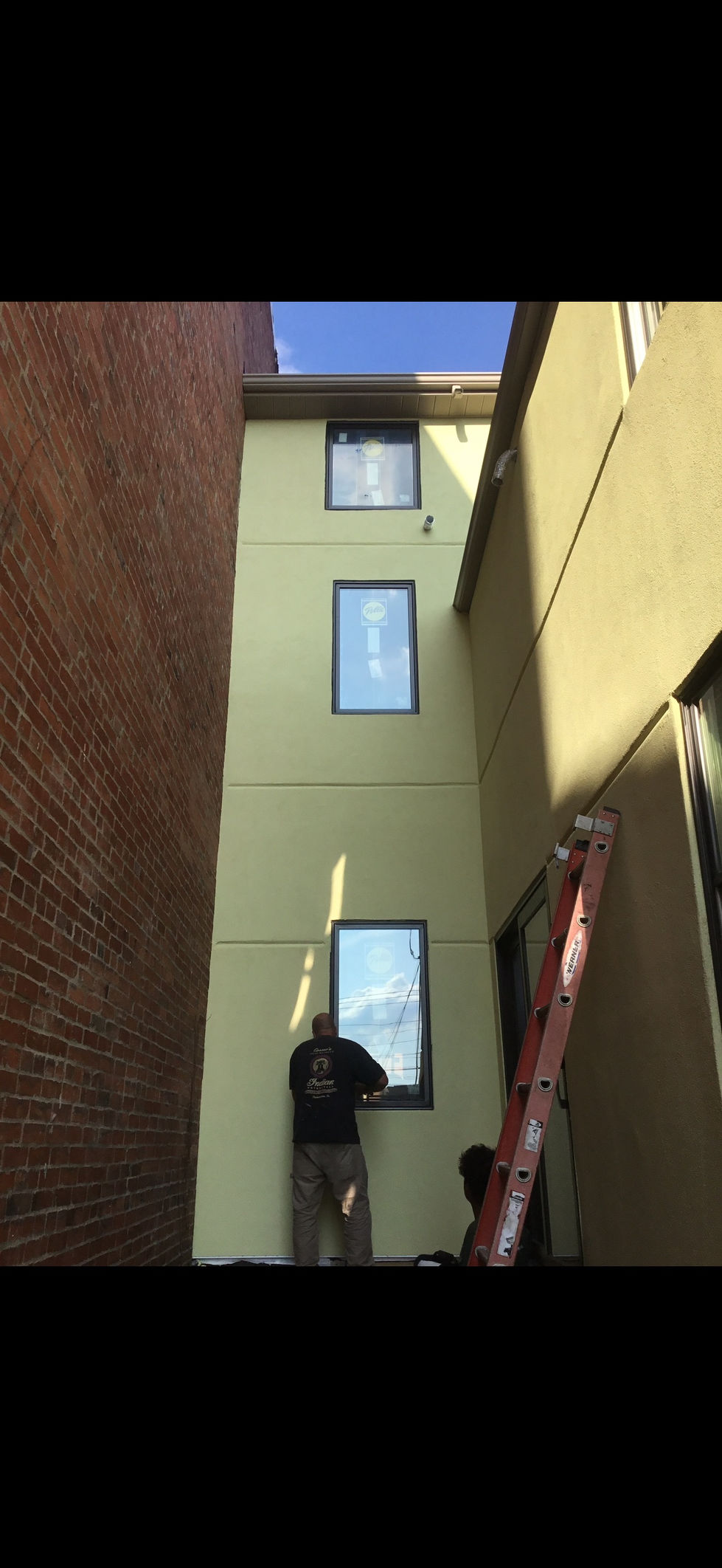 A collection of images showcasing various exterior renovation projects, including building facades, scaffolding, and ladder work. During the exterior refinishing process.